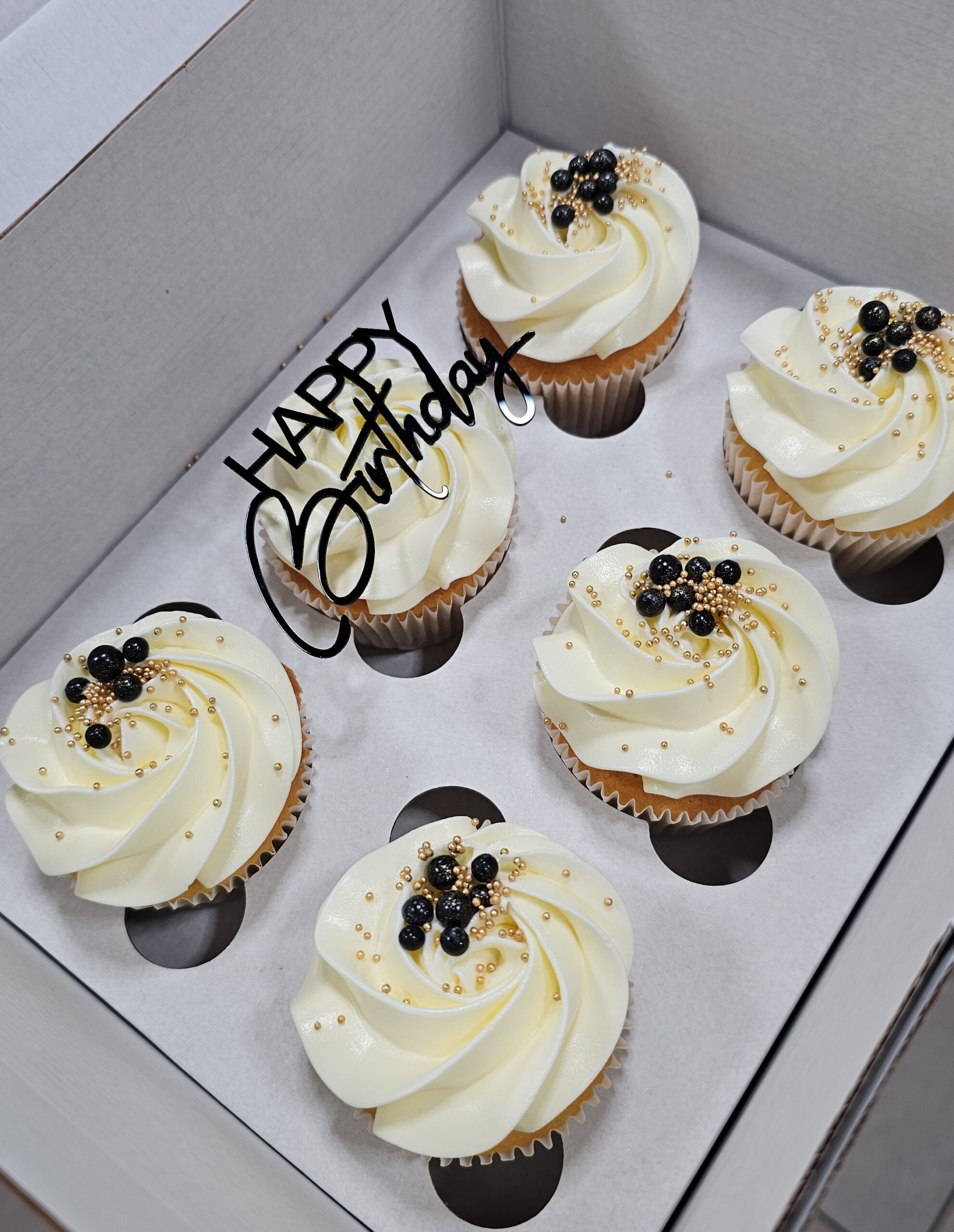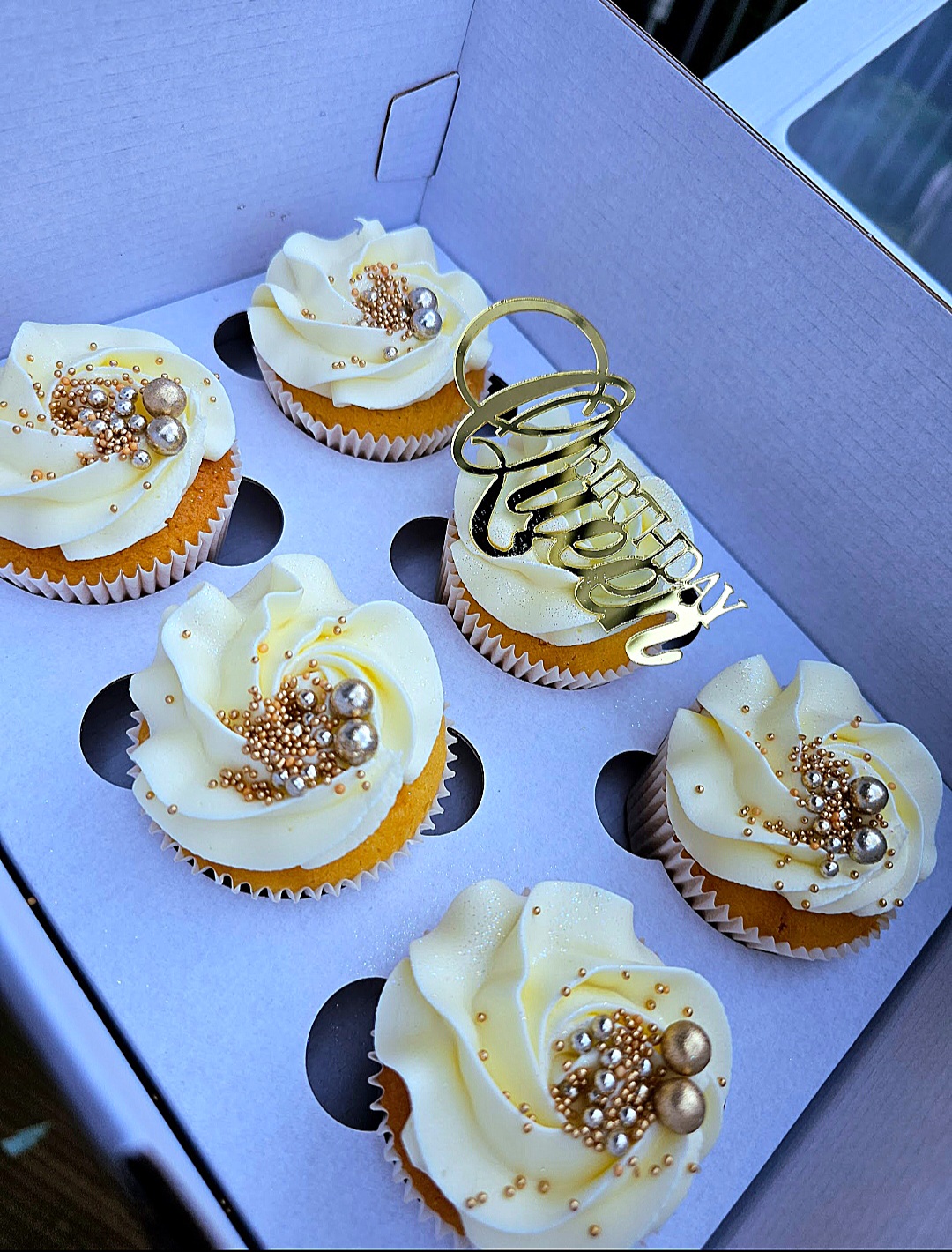 Onze vanille cupcakes kunnen in de gewenste kleuren combinaties gemaakt worden met een toepasselijke tekst naar keus.