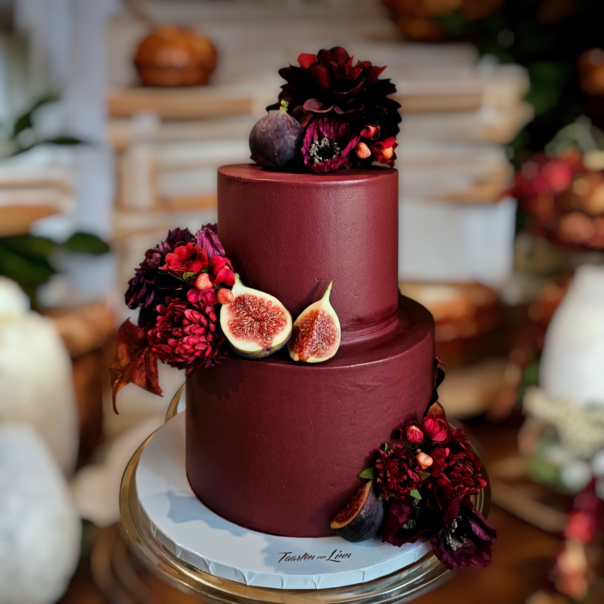 Onze Fancy Nancy is een elegante stapeltaart in een klassieke burgundy tint, gedecoreerd met bordeauxrode kunstbloemen en verse vijgen voor een luxueuze, romantische uitstraling. Perfect voor  stijlvolle events. Deze taart combineert verfijnde elegantie met een warme, rijke kleurbeleving. Deze taart is een echte eyecatcher op elke tafel.