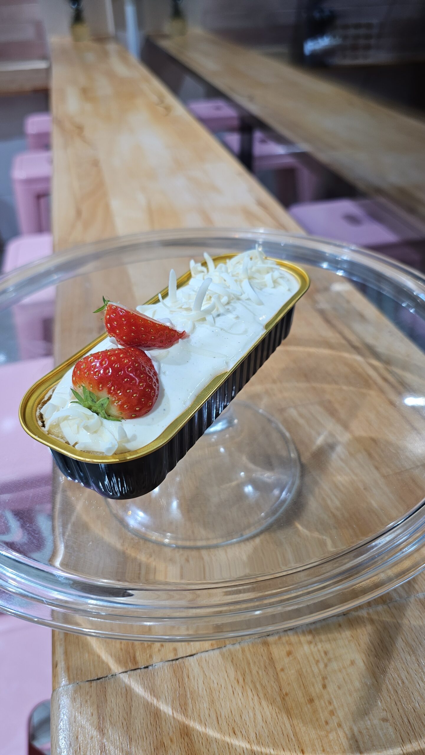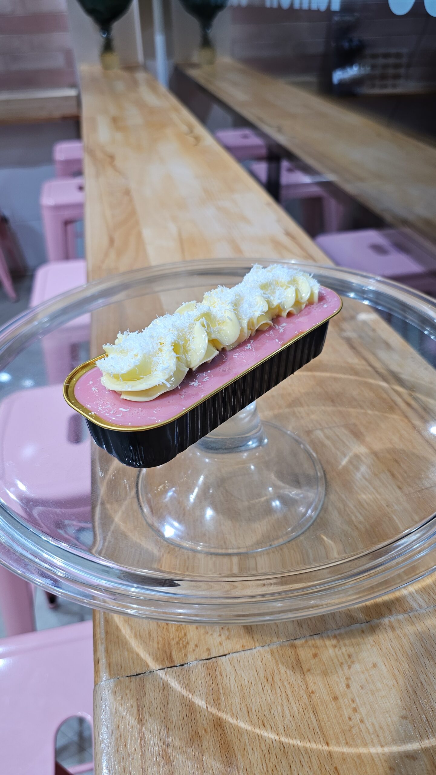 kokos cheesecake afgetopt met dawet glazuur en kokosrasp
